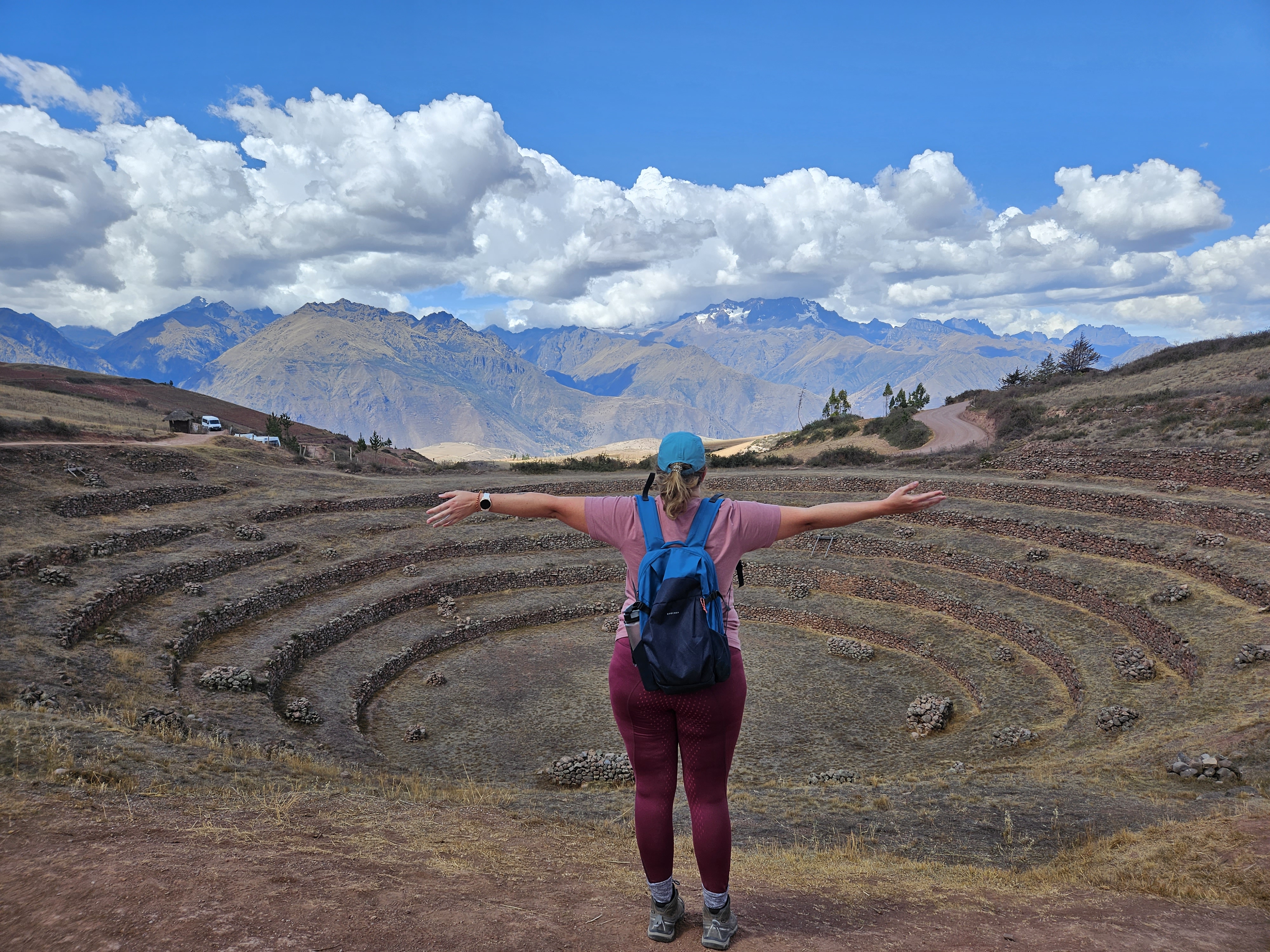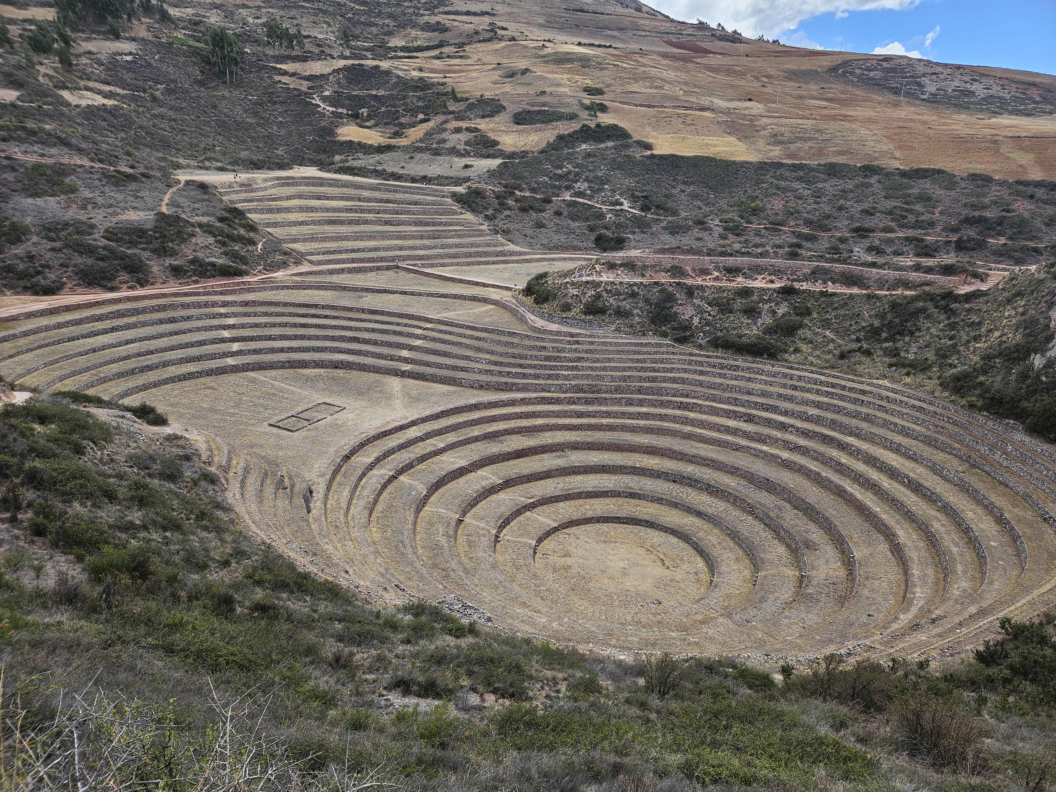 The next stop on this day trip was to see Moray, an ancient Inca agricultural sight. My first toe dip into ancient Inca structures in the Sacred Valley. It was pretty cool I suppose. We walked around it, the sun was bright and beautiful, and we learned how the Incas figured out that crops grow differently at different altitude levels. So a potato planted on the top ring would turn out to be a different size than those planted in the inner circle. Wild!
