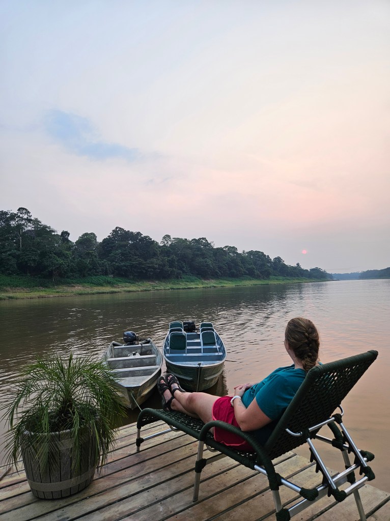 All the activities happen either right around dusk or in the morning, because during the day it is just too hot. There is air conditioning in the room, but you have to keep the windows closed because it is just a screen. So you either sit in a cold dark room, or you go to the hammock area to enjoy the view and the river. That was me- sweaty, but at least I was enjoying the location!
